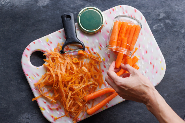 1. Trim the carrots, rinse and peel if not organic. Slice into thin sticks about the same size and thickness.